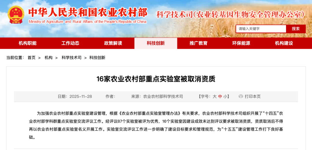 16家农业农村部重点实验室被取消资质