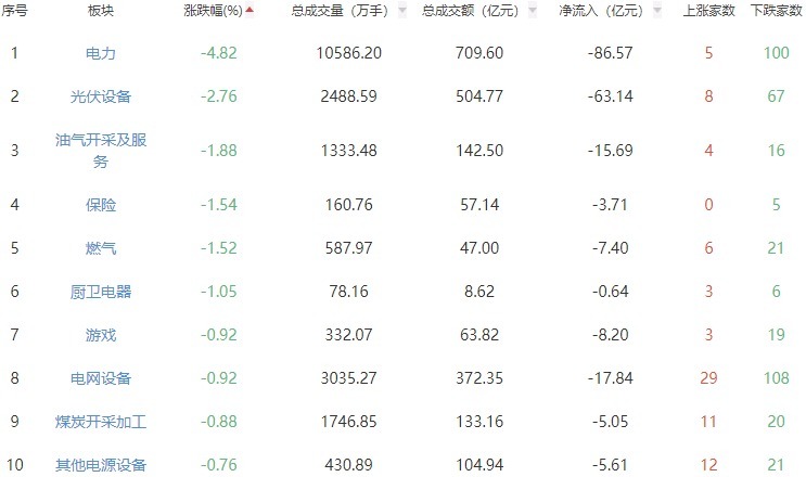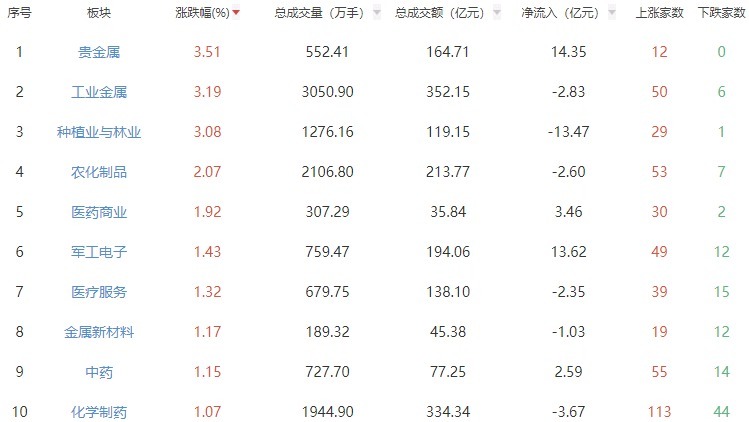 行业板块方面,贵金属、工业金属、种植业与林业等板块涨幅居前,电力、光伏设备、油气开采及服务等板块跌幅居前。