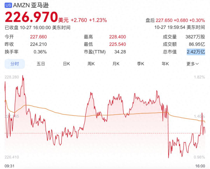 截至美东时间10月27日收盘,亚马逊股价上涨1.23%,报226.97美元,总市值2.42万亿美元。
