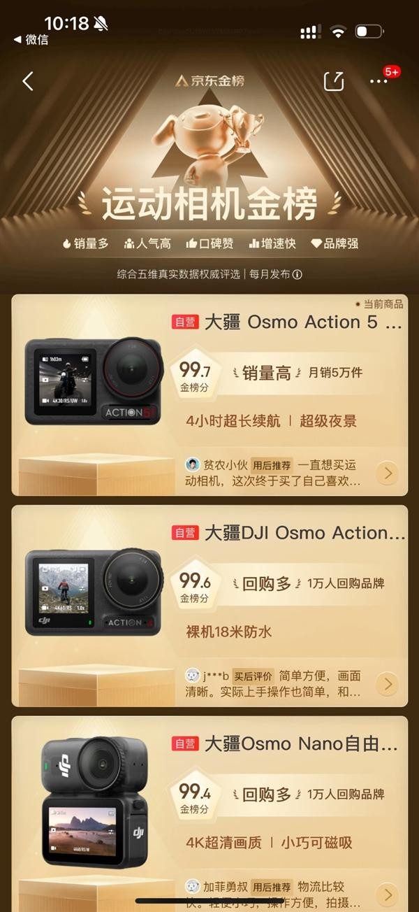 最近京东“运动相机金榜”出炉,也见证了整个运动相机赛道,已经彻底进入“大疆时间”。大疆OsmoAction5Pro、大疆OsmoNano、大疆OsmoAction4三款产品直接包揽运动相机金榜前三。