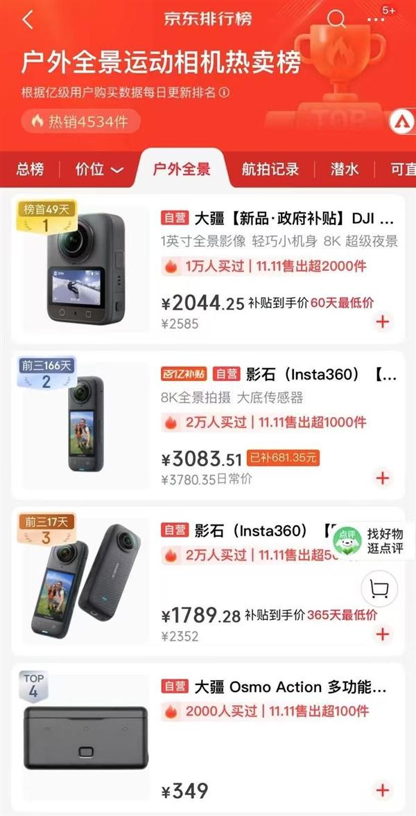 从更详细的市场表现上看,在京东“户外全景运动相机热卖榜”中,大疆Osmo360发布接近不到3个月也夺得榜首,且已经在此领域上占据了49天的位置