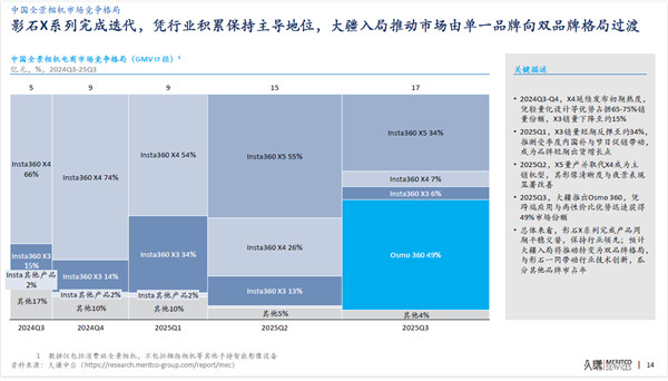 全景相机的市场格局也迎来激烈变动。大疆于今年7月31日入局该领域,在不到三个月的时间内,其首款全景相机Osmo360,凭借跨端应用与高性价比的优势,分别在中国电商渠道获得了49%的市场份额,全球市场份额达43%。