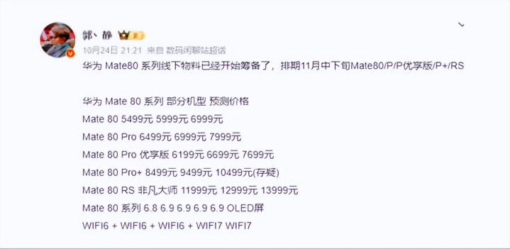 从目前业内给出的预测看,Mate 80 大概率会从 5499 元起步;Pro 起点拉到 6499 元;而更强调设计与配置平衡的“优享版”,会落在 6199—7699 元这段空间里。