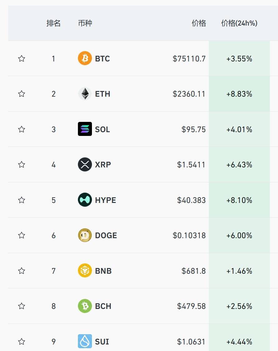3月17日,加密货币市场集体大涨,比特币突破7.5万美元,日内涨幅超3%;以太坊突破2300美元,涨幅接近9%。SOL、XRP、狗狗币等同步走高。