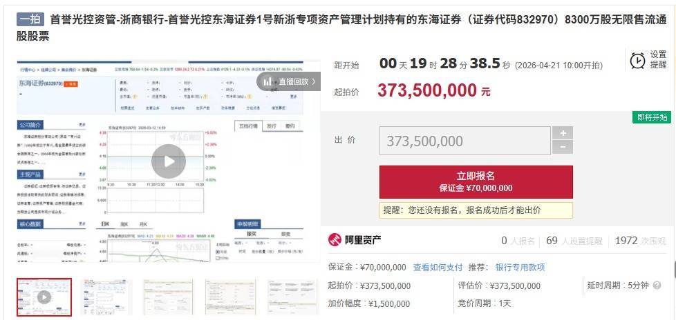 【大河财立方消息】近日,阿里资产司法拍卖平台显示,东海证券8300万股无限售流通股股票正式上架,将于4月21日开拍,起拍价3.735亿元。截至发稿,已有69人对该拍卖信息设置提醒长沙股票配资公司,但尚未有人报名。