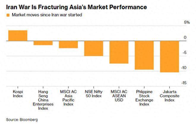 南亚与东南亚地区受油价走高冲击,贸易收支承压,印度、印尼、菲律宾股市接连下挫;而东亚市场火热追捧芯片与人工智能(AI)企业,韩国、中国台湾地区股指屡创历史新高,中东地缘冲突的影响几乎被市场无视。